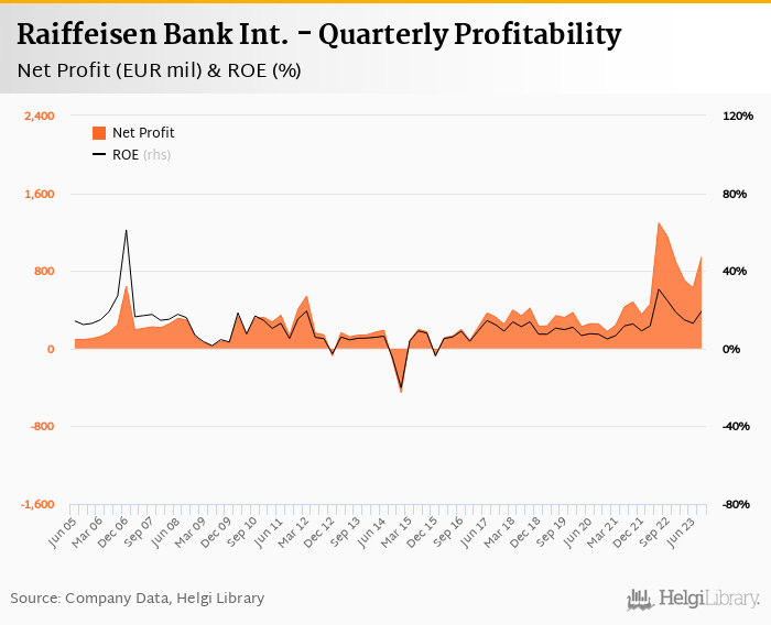 Raiffeisen Bank Int. made a net profit of EUR 947 mil in the third quarter of 2023, down 18% when compared to the same period of last year. This implies a return on equity of 19.3%.