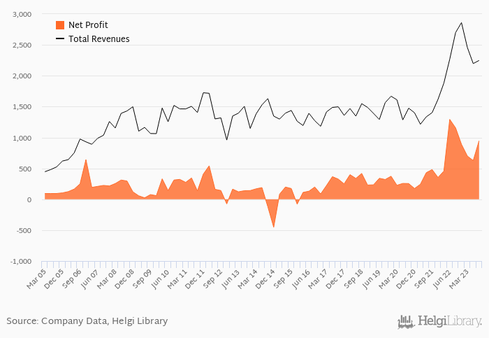On the other hand, bank’s revenues amounted to an all time high of EUR 2,861 mil in 4Q2022 and an all time low of EUR 446 mil in 1Q2005. The average revenues in the last six quarters reached EUR 2,455 mil.