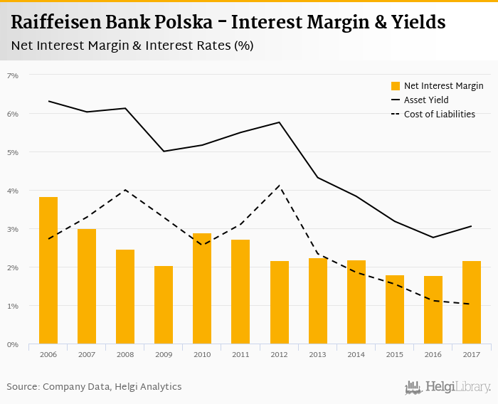 Raiffeisen Bank Polska's net interest margin amounted to 2.16% in 2017, up from 1.77% compared to the previous year.