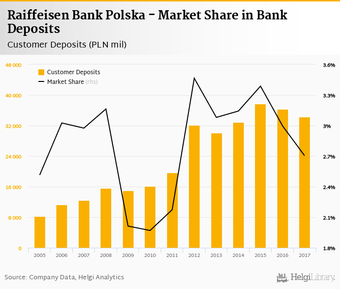 Raiffeisen Bank Polska accounted for 2.70% of all customer deposits taken by banks in Poland at the end of 2017. Historically, the bank’s market share in customer deposits reached an all time high of 3.46% in 2012 and an all time low of 1.97% in 2010.