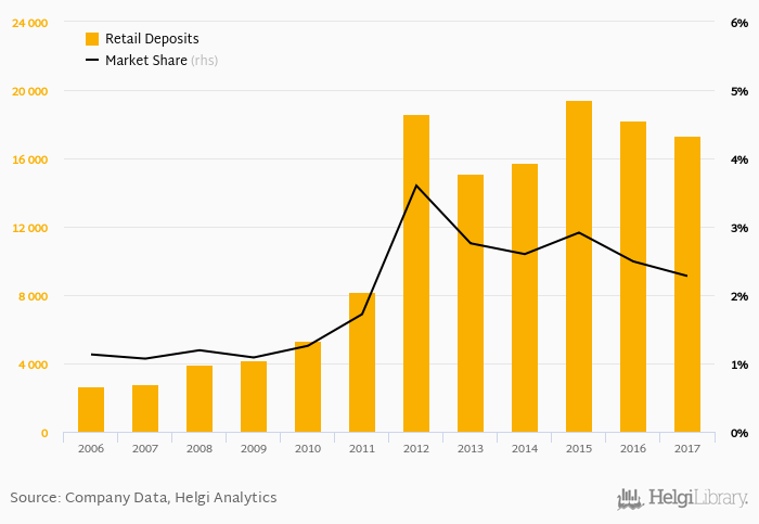 Raiffeisen Bank Polska accounted for 2.28% of all retail deposits taken by banks in Poland at the end of 2017. Historically, the bank’s market share in retail deposits reached an all time high of 3.60% in 2012 and an all time low of 1.07% in 2007.