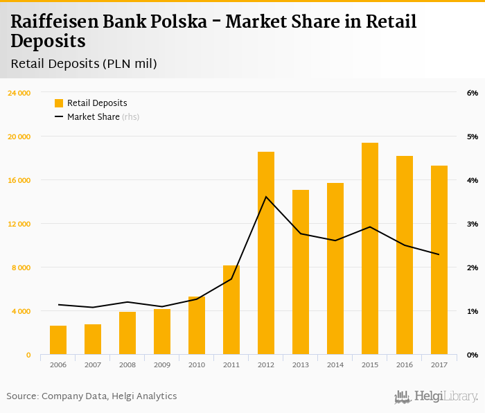 Raiffeisen Bank Polska's retail deposits reached PLN 17,353 mil in 2017, down 4.75% compared to the previous year.