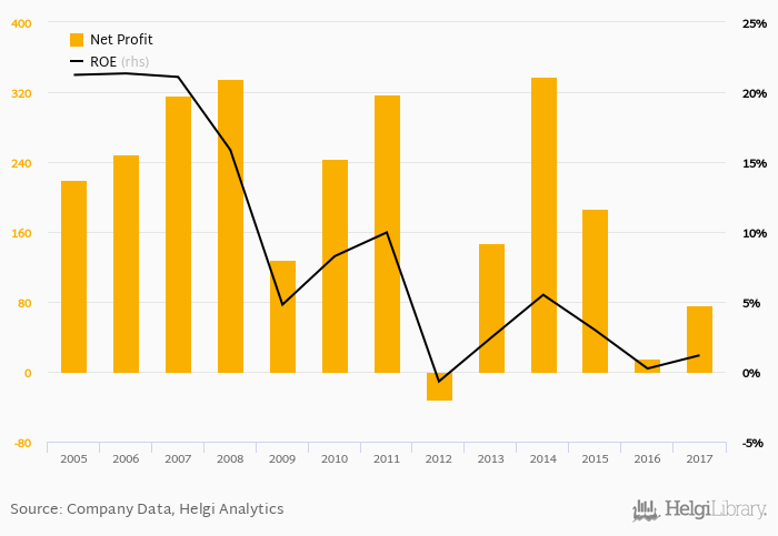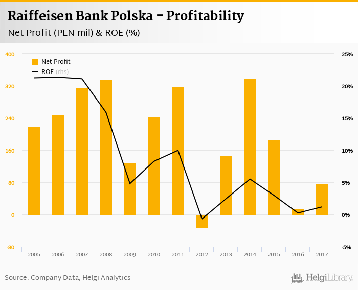 Raiffeisen Bank Polska made a net profit of PLN 75.6 mil in 2017, up 412% compared to the previous year. This implies a return on equity of 1.18%.