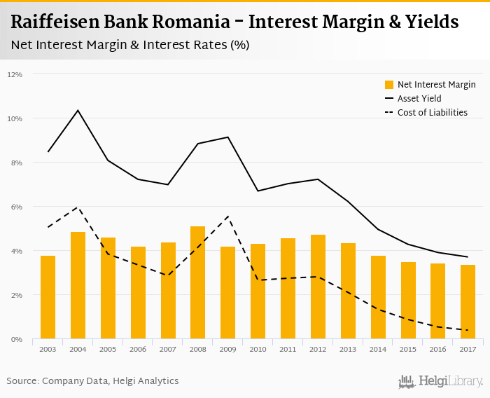 Raiffeisen Bank Romania's net interest margin amounted to 3.35% in 2017, down from 3.42% compared to the previous year.