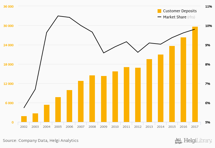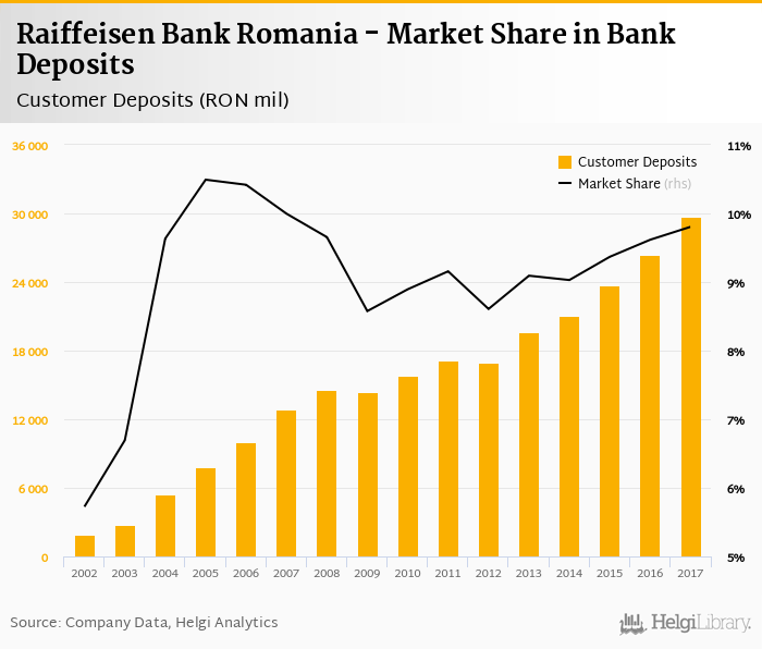 Raiffeisen Bank Romania accounted for 9.80% of all customer deposits taken by banks in Romania at the end of 2017. Historically, the bank’s market share in customer deposits reached an all time high of 10.5% in 2005 and an all time low of 5.72% in 2002.