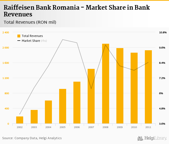 As a result, Raiffeisen Bank Romania accounted for 8.42% of all bank revenues generated by banks in Romania in 2011. Historically, the bank’s market share in total revenues reached an all time high of 10.2% in 2005 and an all time low of 4.33% in 2002.