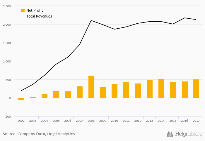 On the other hand, bank’s revenues amounted to an all time high of RON 2,172 mil in 2016 and an all time low of RON 191 mil in 2002. The average revenues in the last five years reached RON 2,090 mil.