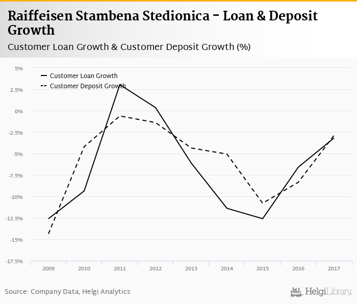 Raiffeisen Stambena Stedionica's customer loan growth reached -3.19% in 2017, up from -6.58% compared to the previous year. Historically, the bank’s loans growth reached an all time high of 3.04% in 2011 and an all time low of -12.6% in 2009. In the last decade, the average annual loan growth amounted to 0%.
