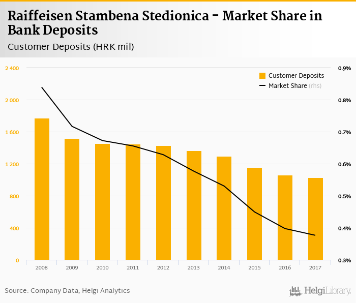Raiffeisen Stambena Stedionica accounted for 0.376% of all customer deposits taken by banks in Croatia at the end of 2017. Historically, the bank’s market share in customer deposits reached an all time high of 0.839% in 2008 and an all time low of 0.376% in 2017.
