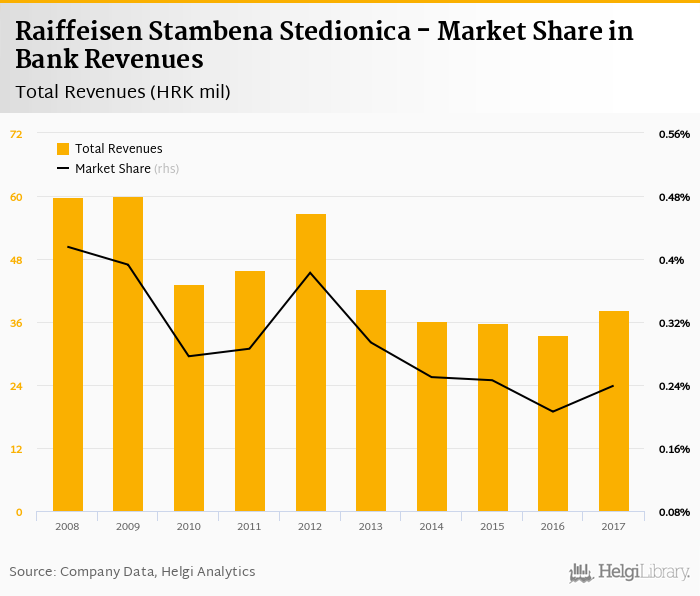 As a result, Raiffeisen Stambena Stedionica accounted for 0.239% of all bank revenues generated by banks in Croatia in 2017. Historically, the bank’s market share in total revenues reached an all time high of 0.416% in 2008 and an all time low of 0.206% in 2016.