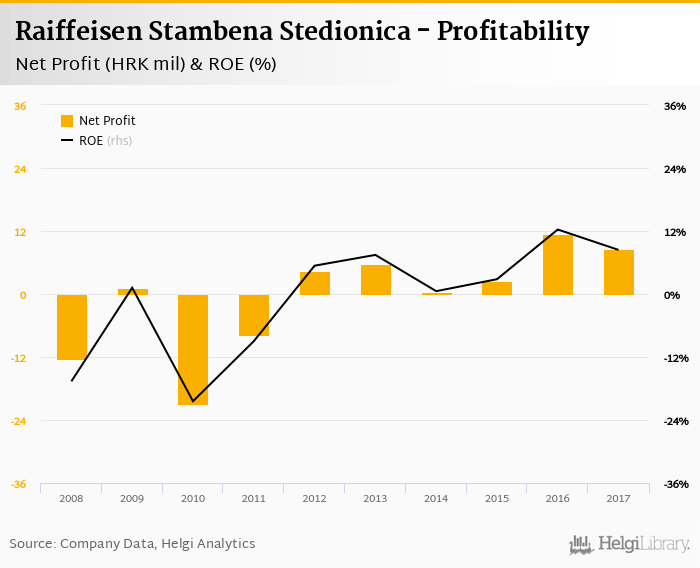 Raiffeisen Stambena Stedionica made a net profit of HRK 8.64 mil in 2017, down 24.3% compared to the previous year. This implies a return on equity of 8.39%.