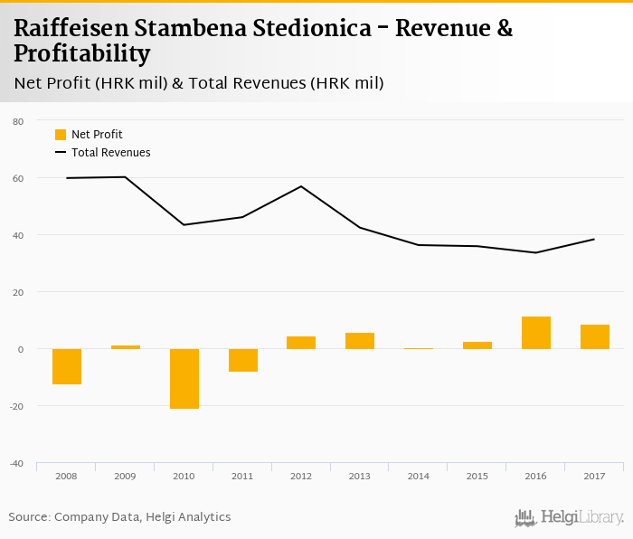 Raiffeisen Stambena Stedionica made a net profit of HRK 8.64 mil under revenues of HRK 38.3 mil in 2017, up -24.3% and 14.3% respectively compared to the previous year.