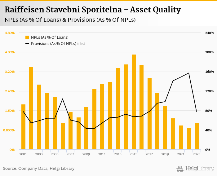 Comparing Raiffeisen Stavebni Sporitelna with its closest peers, CSOB Stavebni Sporitelna operated at the end of 2023 with NPL ratio of 1.61% and provision coverage of 80.8% and Modra Pyramida Stavebni Sporitelna with 1.12% and 53.1% respectively.