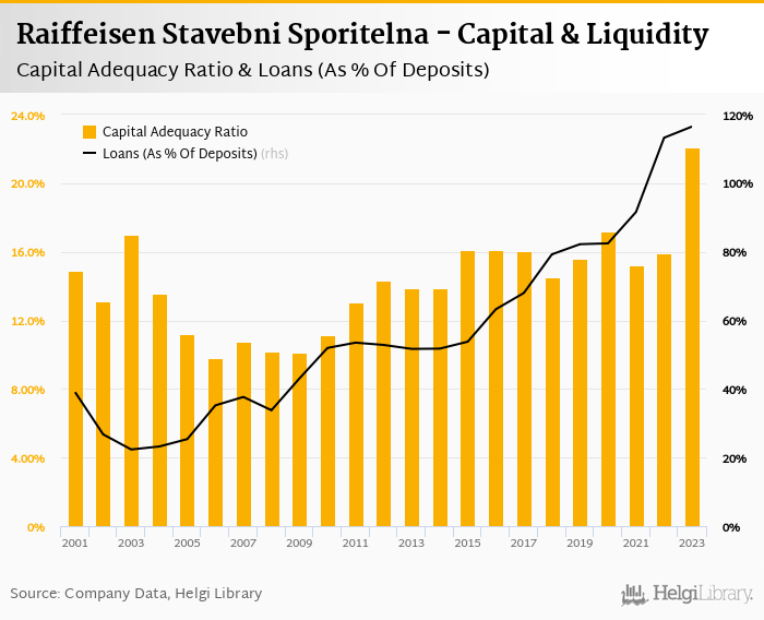Comparing Raiffeisen Stavebni Sporitelna with its closest peers, CSOB Stavebni Sporitelna ended the year 2023 with a capital adequacy ratio at 31.2% and loans to deposits of 98.7% and Modra Pyramida Stavebni Sporitelna with 33.5% and 179% respectively.