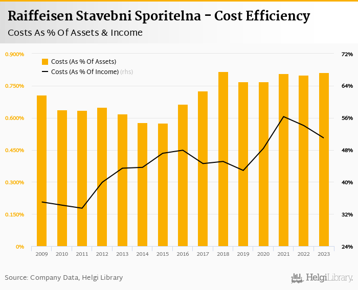 Raiffeisen Stavebni Sporitelna's cost to income ratio reached 51.0% in 2023, down from 54.1% compared to the previous year.