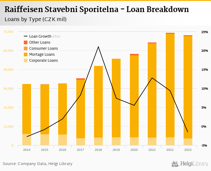 At the end of 2023, Raiffeisen Stavebni Sporitelna's loans accounted for 117% of total deposits and 85.3% of total assets.