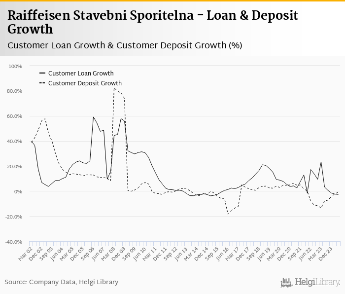Raiffeisen Stavebni Sporitelna's customer loan growth reached -2.74% in 2024-06-30, down from 3.19% compared to the previous year. Historically, the bank’s loans growth reached an all time high of 59.1% in 2006-09-30 and an all time low of -3.85% in 2015-03-31. In the last decade, the average annual loan growth amounted to 5.91%.