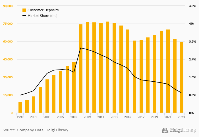 Raiffeisen Stavebni Sporitelna accounted for 0.887% of all customer deposits taken by banks in Czechia at the end of 2023. Historically, the bank’s market share in customer deposits reached an all time high of 2.90% in 2008 and an all time low of 0.784% in 1999.