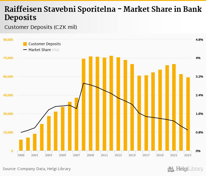 Raiffeisen Stavebni Sporitelna's customer deposits reached CZK 59,434 mil in 2023, down 4.36% compared to the previous year.
