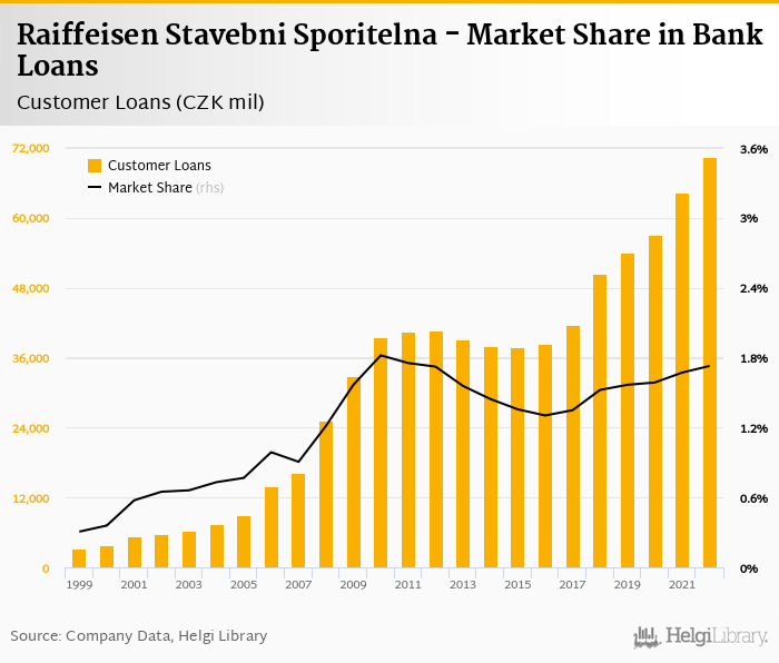 Raiffeisen Stavebni Sporitelna accounted for 1.73% of all customer loans issued in Czechia at the end of 2022. Historically, the bank’s market share in customer loans reached an all time high of 1.82% in 2010 and an all time low of 0.307% in 1999.