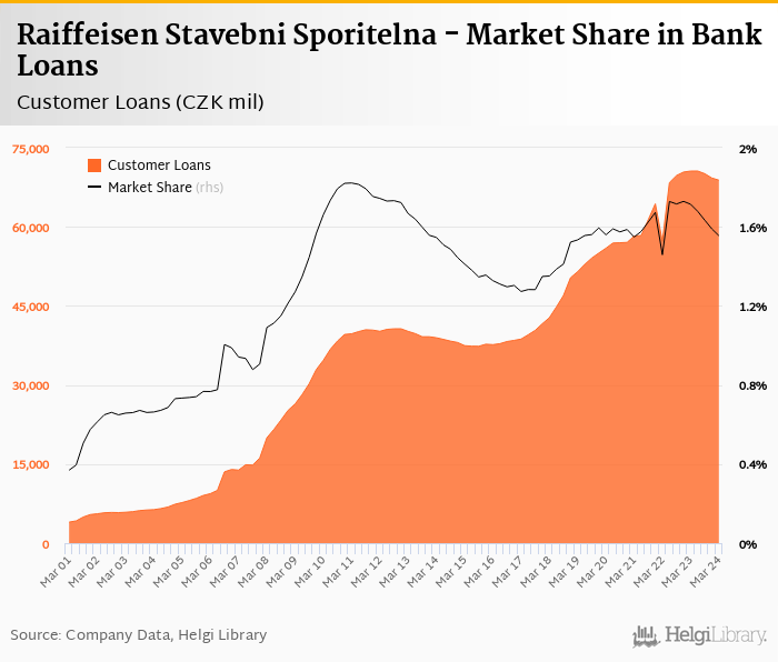 Raiffeisen Stavebni Sporitelna's customer loans reached CZK 68,849 mil in 2024-03-31, down 0.585% compared to the previous year.
