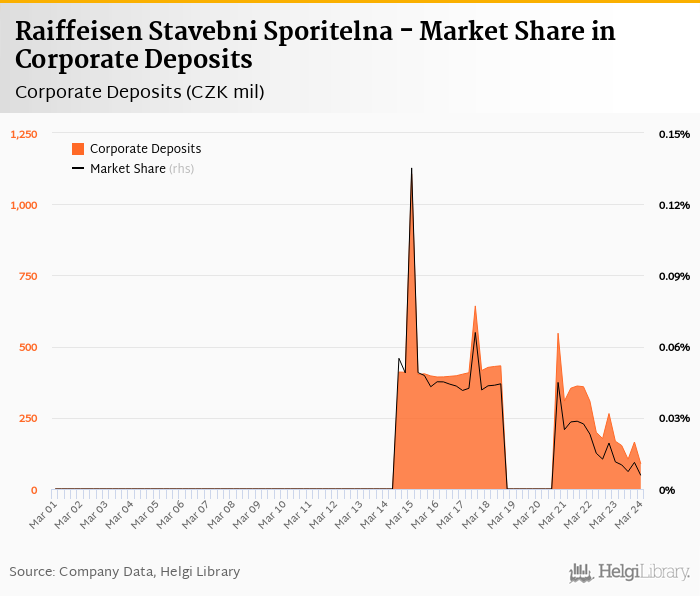 Raiffeisen Stavebni Sporitelna accounted for 0.006% of all corporate deposits taken by banks in Czechia at the end of 2024-03-31. Historically, the bank’s market share in corporate deposits reached an all time high of 0.135% in 2015-03-31 and an all time low of 0% in 2001-03-31.