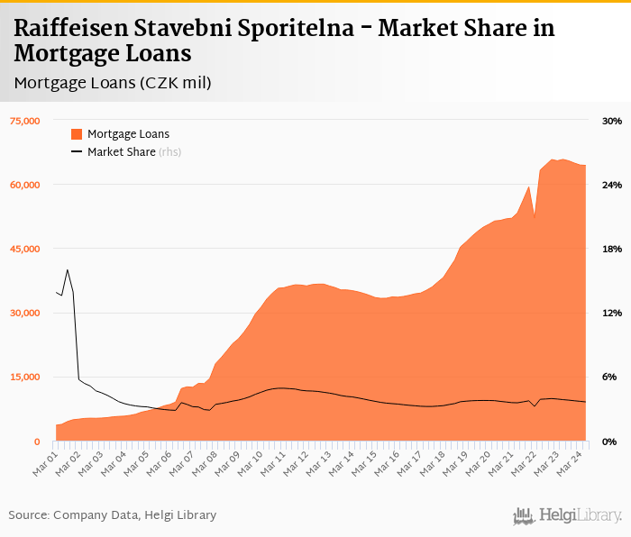 Raiffeisen Stavebni Sporitelna's mortgage loans reached CZK 64,347 mil in 2Q2024, down 0.131% compared to the previous year.