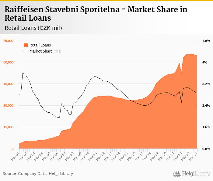 Raiffeisen Stavebni Sporitelna's retail loans reached CZK 64,432 mil in the first quarter of 2024, down 0.700% compared to the previous year.