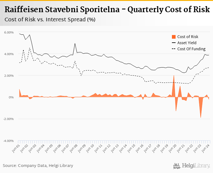Raiffeisen Stavebni Sporitelna's Cost of Risk (loan loss provisions as % of total assets) amounted to -0.221% in the second quarter of 2024, down from 0.214% when compared to the previous quarter.