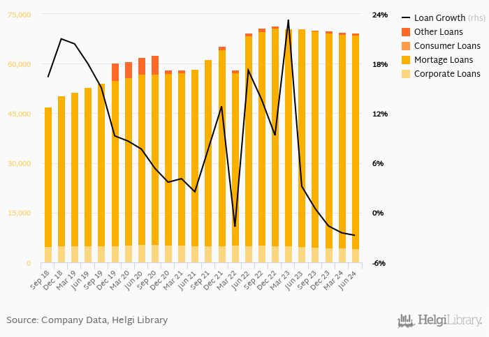 Mortgage loans represented 92.9% of the bank's loan book at the end of the year 2Q2024, consumer further 0% and corporate loans 6.17% of total loans.