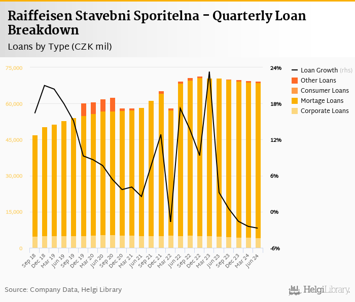 At the end of second quarter of 2024, Raiffeisen Stavebni Sporitelna's loans accounted for 118% of total deposits and 87.7% of total assets.