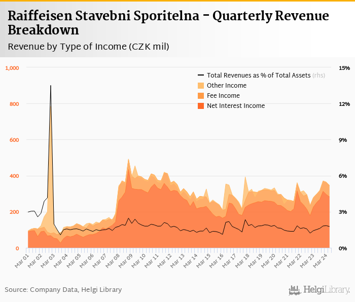 Raiffeisen Stavebni Sporitelna generated total banking revenues of CZK 346 mil in the second quarter of 2024, up 16.2% when compared to the same period of last year and down 4.82% when compared to the previous quarter.