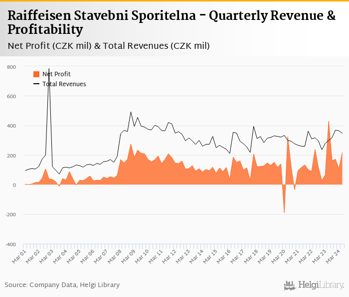 When compared to bank's main peers, CSOB Stavebni Sporitelna generated a quarterly net profit of CZK 402 mil with revenues of CZK 701 mil in 2Q2024 and Modra Pyramida Stavebni Sporitelna netted CZK 104 mil (revenues of CZK 442 mil).