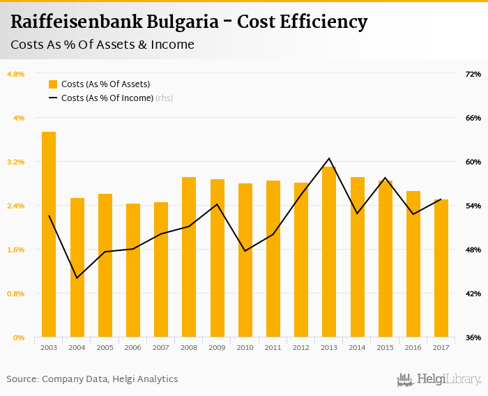 Raiffeisenbank Bulgaria's cost to income ratio reached 54.8% in 2017, up from 52.7% compared to the previous year.