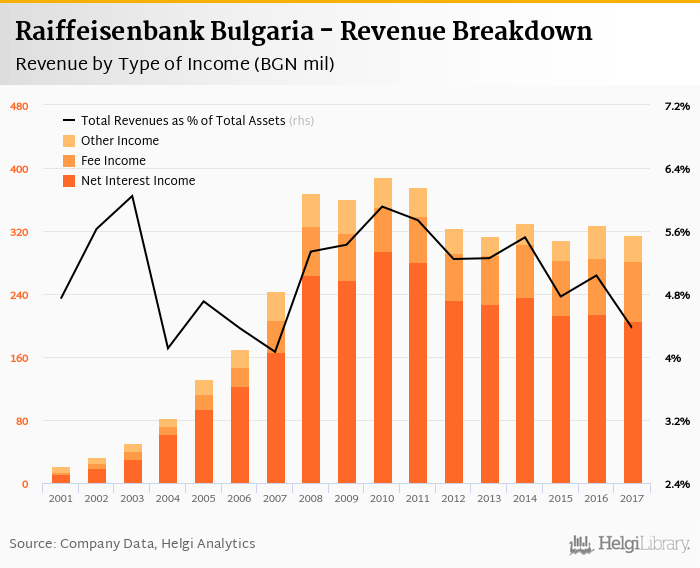 Comparing Raiffeisenbank Bulgaria with its closest peers, DSK Bank generated total revenues of 5.78% of assets in 2017, United Bulgarian Bank operated with 4.70% revenue margin and UniCredit Bulbank produced total income worth 4.29% of assets.