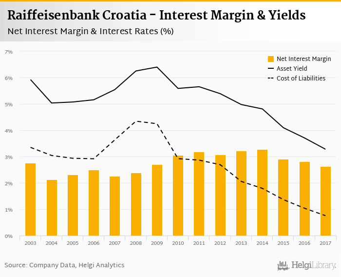 Comparing Raiffeisenbank Croatia with its closest peers, Zagrebacka Banka operated in 2017 with a net interest margin of 2.80% in 2017, Splitska Banka reached 2.82% and Privredna Banka Zagreb some 2.94%.