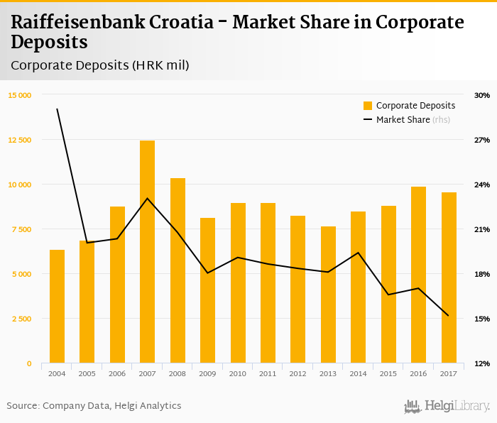 Raiffeisenbank Croatia accounted for 15.1% of all corporate deposits taken by banks in Croatia at the end of 2017. Historically, the bank’s market share in corporate deposits reached an all time high of 29.1% in 2004 and an all time low of 15.1% in 2017.