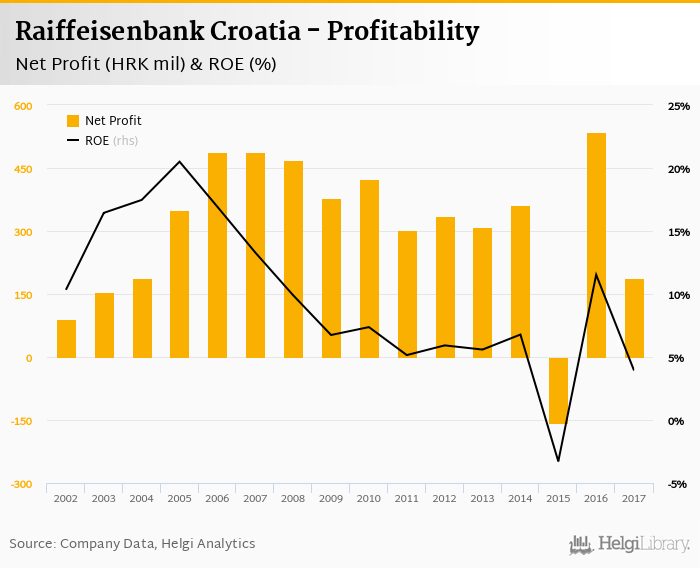 Raiffeisenbank Croatia made a net profit of HRK 188 mil in 2017, down 64.9% compared to the previous year. This implies a return on equity of 3.93%.