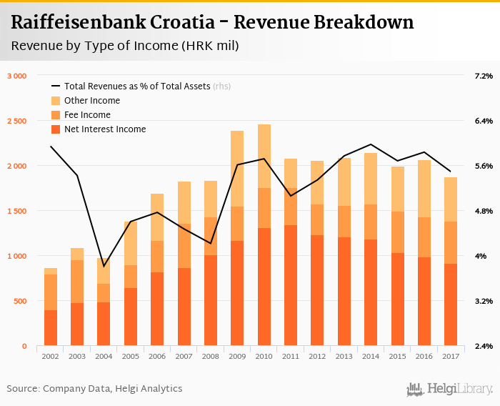 Comparing Raiffeisenbank Croatia with its closest peers, Zagrebacka Banka generated total revenues of 4.30% of assets in 2017, Splitska Banka operated with 4.20% revenue margin and Privredna Banka Zagreb produced total income worth 4.77% of assets.