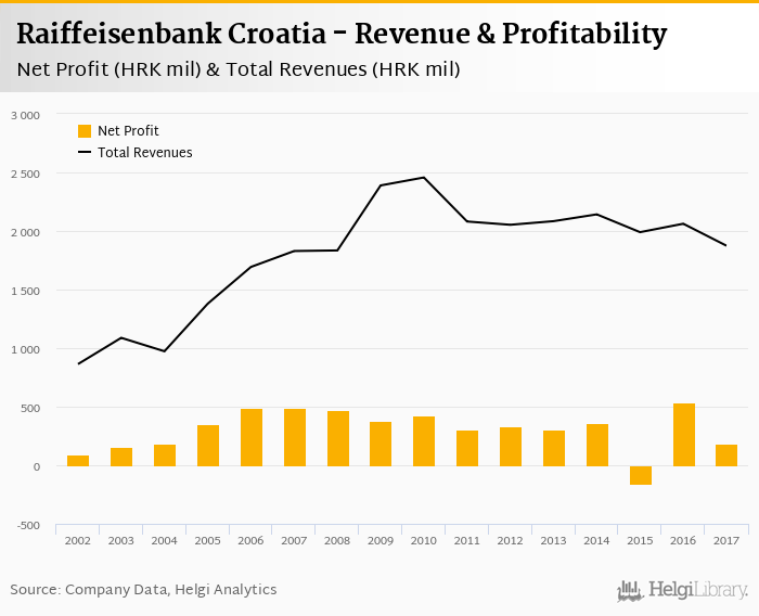 Comparing Raiffeisenbank Croatia with its closest peers, Zagrebacka Banka generated a net profit of HRK 1,042 mil with revenues of HRK 5,451 mil in 2017, Splitska Banka netted HRK -85.0 mil (revenues of HRK 1,129 mil) and Privredna Banka Zagreb announced a net profit of HRK 1,331 mil (revenues of HRK 4,908 mil).