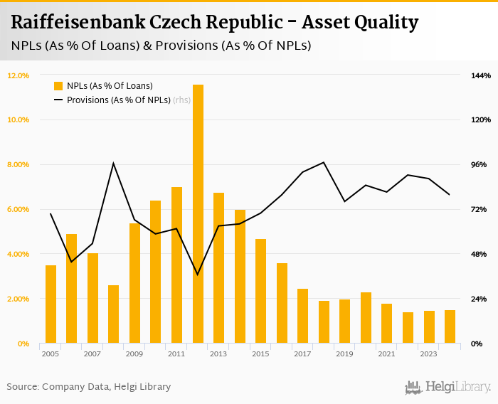 Raiffeisenbank Czech Republic's non-performing loans reached 1.50% of total loans at the end of 2024, up from 1.47% compared to the previous year. Historically, the NPL ratio hit an all time high of 11.6% in 2012 and an all time low of 1.39% in 2022.