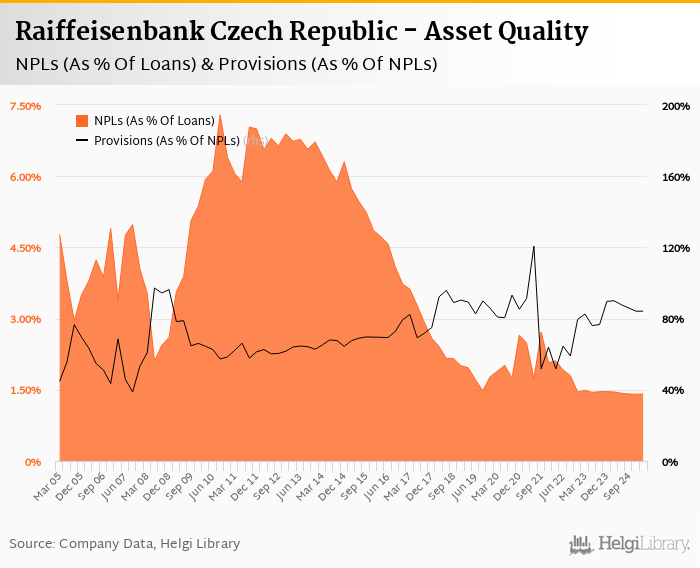 Raiffeisenbank Czech Republic's non-performing loans reached 1.41% of total loans at the end of 2025-03-31, down from 1.46% compared to the previous year. Historically, the NPL ratio hit an all time high of 7.29% in 2010-09-30 and an all time low of 1.41% in 2024-12-31.