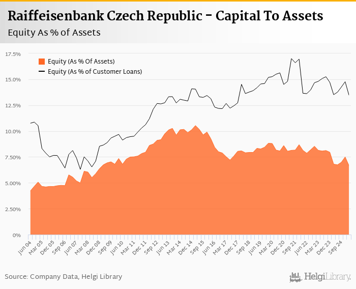 Raiffeisenbank Czech Republic's Equity reached 6.65% of total assets in the 1Q2025, down from 6.80% for the previous year. As a share of net customer loans, the ratio amounted to 13.5% at the end of the first quarter of 2025.