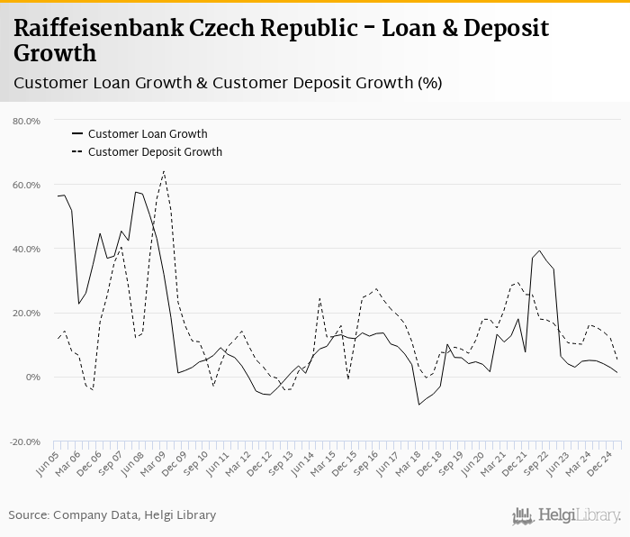 At the end of 2025-03-31, Raiffeisenbank Czech Republic's loans accounted for 60.3% of total deposits and 49.5% of total assets.