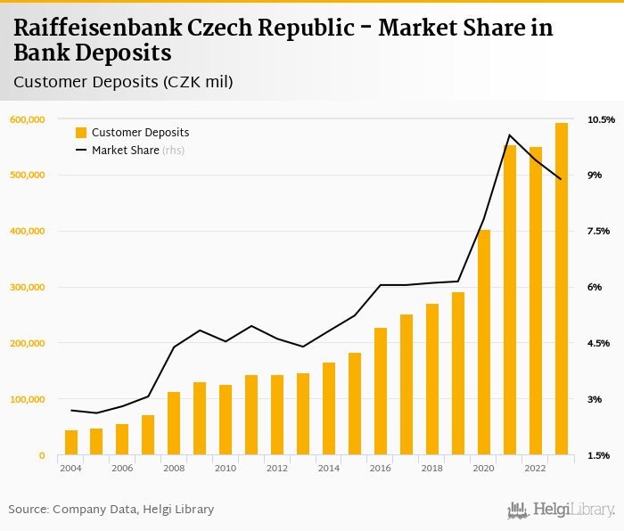 Raiffeisenbank Czech Republic's customer deposits reached CZK 593,995 mil in 2023, up 7.99% compared to the previous year.
