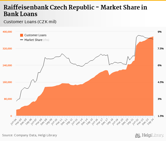 Raiffeisenbank Czech Republic's customer loans reached CZK 375,631 mil in 2024-09-30, up 0.670% compared to the previous year.