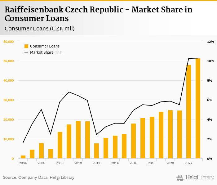 Raiffeisenbank Czech Republic's consumer loans reached CZK 51,398 mil in 2023, up 7.00% compared to the previous year.