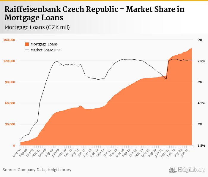 Raiffeisenbank Czech Republic accounted for 7.53% of all mortgage loans issued in Czechia at the end of 4Q2024. Historically, the bank’s market share in mortgage loans reached an all time high of 7.61% in 3Q2022 and an all time low of 1.85% in 4Q2004.