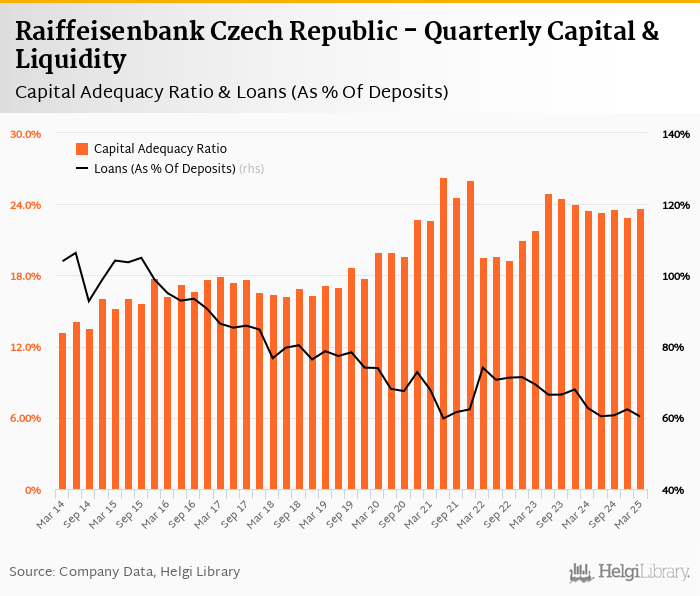 Raiffeisenbank Czech Republic's capital adequacy ratio reached 23.7% at the end of first quarter of 2025, up from 22.9% when compared to the previous quarter. Historically, the bank’s capital ratio hit an all time high of 26.3% in 2Q2021 and an all time low of 13.3% in 1Q2014.