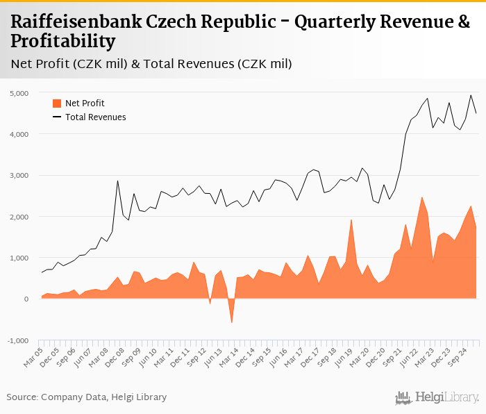 Raiffeisenbank Czech Republic made a net profit of CZK 1,694 mil under revenues of CZK 4,484 mil in the first quarter of 2025, up 20.9% and 6.93% respectively when compared to the same period last year.